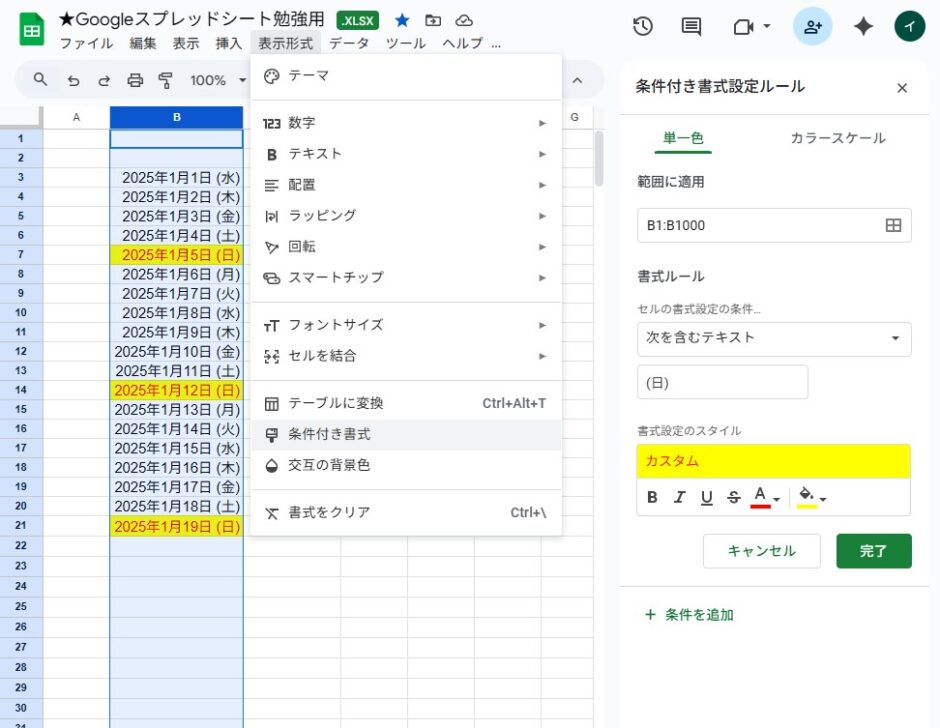 Googleスプレッドシートで曜日に色を付ける方法
